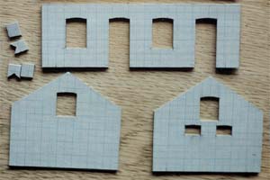 Pappets tykkelse afhænger af formålet. Jo større flader, jo tykkere pap bør der bruges. Desværre vokser besværet med at skære i pappet tilsvarende. Man må derfor gøre op med sig selv, om man vil benytte tykt pap, der har den fornødne stivhed, eller tyndere pap, der så må stives af med lister på indersiden af murene. 6x6 mm lister, der kan købes på byggemarkeder, er velegnede, f.eks. anbragt langs sokkelen eller henover vinduerne. Brug af afstivning vil dog være vanskelig eller umulig, hvis bygningens indvendige dele også skal modelleres og forsynes med udstyr. Til udvendige mure bør pappets tykkelse være mindst 1,5 mm, men ikke tykkere end 3,0 mm, da det ellers bliver for besværligt at udskære åbninger. Pap i forskellige tykkelser og kvaliteter kan købes hos bog- og papirhandlere, og prisen er overkommelig set i forhold til udbyttet. Det grå pap er udmærket, både til at lime murstenspapir på og til at male på, idet det giver en lidt grov overfladestruktur. Et uundværligt hjælpemiddel er millimeterpapir til optegning af de enkelte mur flader m.v., idet det sikrer, at alle rette vinkler bliver rette, hvilket er overordentligt vigtigt, da selv små skævheder giver anledning til meget besvær, når bygningsdelene skal samles. Millimeterpapir kan købes i A4-blokke hos papirhandlerne. Bedre er det imidlertid at råde over en tegneprogram på en PC eks. Corel Draw, idet det bl.a. giver mulighed for ved kopiering, skalering m.v. at få eksakte tegninger, der udprintes på selvklæbende etiketpapir. Optegning af bygningen. Altså begynder man arbejdet med at tegne alle bygningens mure med tilhørende vinduer og døre ind på millimeterpapir eller ved hjælp af et PC-tegneprogram. Grundlaget er allerhelst en bygningstegning suppleret med fotos, men fotos alene er også et udmærket grundlag, hvis billedet er så tydeligt, at det er muligt at tælle mursten, for at kunne regne dimensionerne ud (1 meter svarer stort set til 4 sten på langs eller 13 skifter i højden inkl. fuger). Det er en god idé - hvis man selv fotograferer bygningen og ikke har mulighed for en egentlig opmåling - at lade en hjemmelavet landmålerstok med 20 cm lange skiftevis røde og hvide felter komme med på billedet, placeret tæt op af muren passende steder. Når dimensionerne er omregnet, vil det når der anvendes millimeterpapir, være hensigtsmæssigt at afrunde resultatet til hele millimeter, da det er lettest at styre udskæringen, d.v.s., opnå ensartede størrelser på ensartede bygningsdele, hvis skærekniven kan følge millimeterstregerne. Før man tegner bygningsfladerne op, må man gøre sig klart, hvorledes hjørnerne skal samles, om det er ved skråskæring eller ved at støde de vinkelret afskårne papstykker op mod hinanden, idet det har indflydelse på længden af de enkelte flader. I sidstnævnte tilfælde kan der blive problemer med at skjule fugen, idet det er min erfaring, at det er lettest at vente med at samle bygningen indtil murene er påklæbet murstenstapet og vinduer og døre er monteret. For mit eget vedkommende bruger jeg næsten altid skråskæringen. ![]() Udskæring. Når bygningen er tegnet op på millimeterpapiret - med spids blyant og i 1:87 - limer man papiret på det udvalgte pap med almindelig hobbylim, der påsmøres papiret med en våd pensel. Der må ikke være tørre pletter, da det giver buler i murfladen. Når limen er blevet tør, kan det ske, at pappet har krummet sig. Ofte kan man bøje pappet, så krumningen forsvinder, eller man kan - som ovenfor nævnt - lime lister på bagsiden, når murfladen er udskåret. Man kan også lime papir på bagsiden samtidig med at millimeterpapiret limes på forsiden. På denne måde ophæver spændingerne hinanden. Når pappet er tørt udskæres vindues- og døråbninger med en skarp hobbykniv. Ved udskæringen er det vigtigt at have et skæreunderlag, der ikke sløver kniven. Gode skæreunderlag kan købes i papirhandelen i forskellige størrelser. Der skæres langs bagkanten af en stål- eller aluminiumlineal. Ved det første snit med kniven er det vigtigt, at snittet ligger præcist langs linealen, d.v.s., der bør ikke trykkes for hårdt, da det er lettest at styre kniven med et let tryk. Det er også vigtigt at følge tegningens linier meget præcist, da små skævheder bliver ret synlige og giver problemer med montering af vinduer og døre. Først når åbningerne er udskåret, skæres murfladen fri langs omridset. Den kant af murelementet, der skal danne hjørne, skal nu bearbejdes, så det danner en skrå flade under 45 grader eller spidsere. Det kan f.eks. ske ved at anbringe pappet oven på en stållineal, der ligger langs kanten af skærebordet. Dernæst lader man hobbykniven følge linealen i en skrå vinkel, så det meste af det overflødige pap fjernes. Resten af pappet fjernes med en slibeblok med sandpapir. Ved at holde de to stykker pap, der skal danne hjørne, op mod hinanden kontrolleres, at hjørnet bliver skarpt, d.v.s., at det ikke gaber. ![]() Murtype. Hvis bygningen skal fremtræde malet, bør der males inden bygningen samles og inden vinduer og døre isættes. I det mindste bør murene grundmales, så der kun er tale om supplerende maling, efter at bygningen er samlet. Hvis bygningen skal fremtræde med murstensvægge, skal der pålimes murstenspapir, inden vinduer og døre isættes, og inden bygningen samles. Et stykke murstenspapir lidt større end den pågældende murflade tilskæres, så en af kanterne følger en vandret fuge. Denne kant skal ved pålimningen følge nederste eller øverste vandrette kant af muren helt præcist, så der ingen skævheder bliver, da selv små skævheder ses ret tydeligt. Når limen er blevet tør, fraskæres det overflødige papir langs murfladens omrids. Det kan også fjernes ved hjælp af en slibeblok med sandpapir. I åbningerne til vinduer og døre gennemskæres papiret diagonalt, og de derved opståede trekanter presses bagud og limes fast til ka